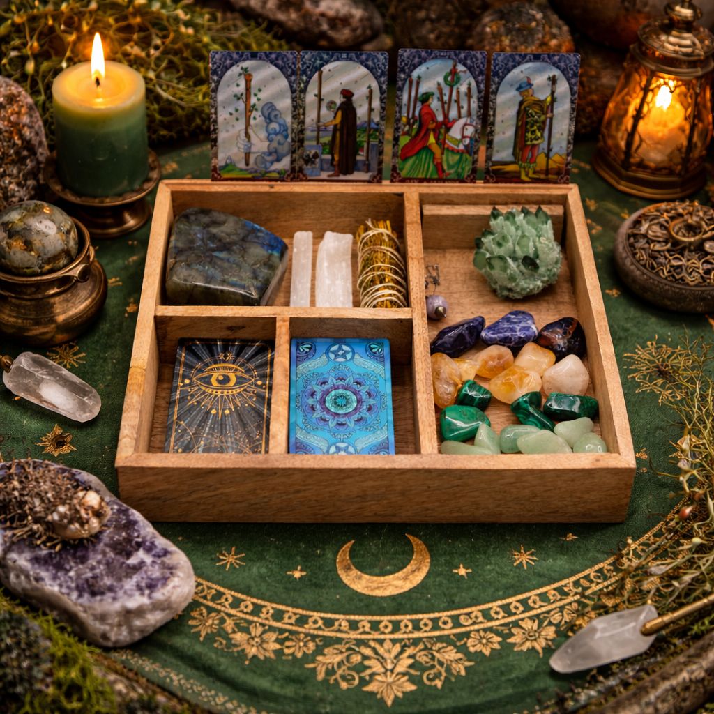 Esta caja de almacenamiento para tarot está diseñada para lectores que trabajan con un conjunto completo de herramientas y quieren que todo esté organizado en un solo lugar. Fabricada con madera natural de mango, presenta una distribución interna cuidadosamente planificada con múltiples compartimentos para separar barajas de tarot, cristales, péndulos, inciensos, ramas de sahumerio y pequeños objetos rituales.